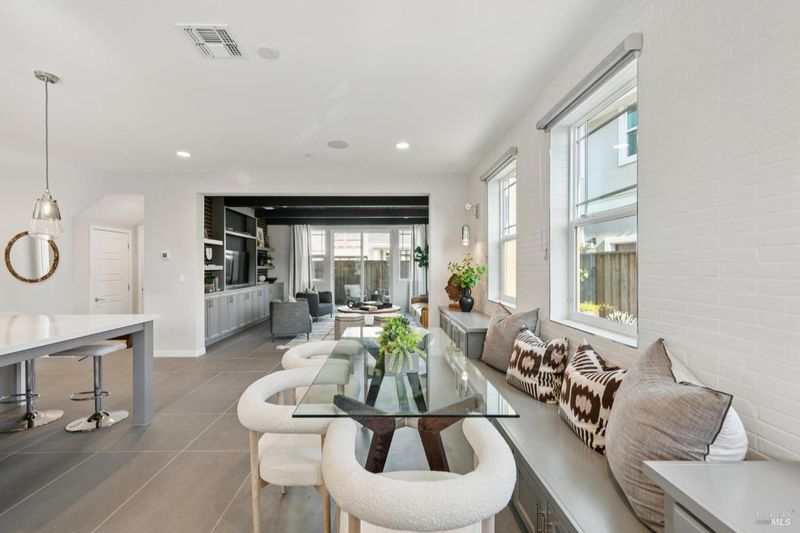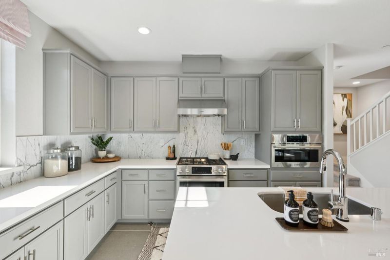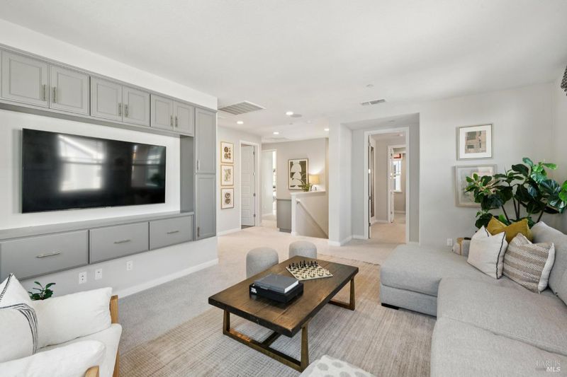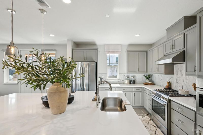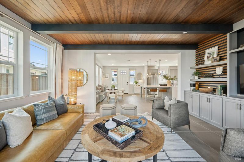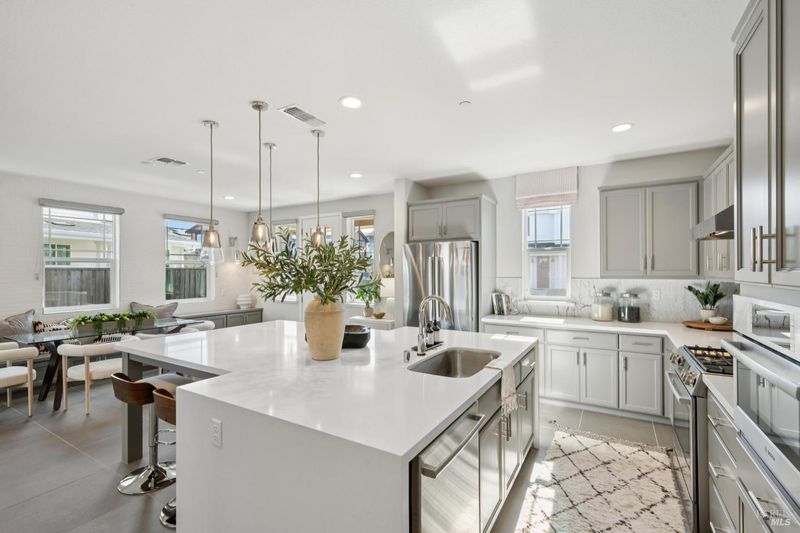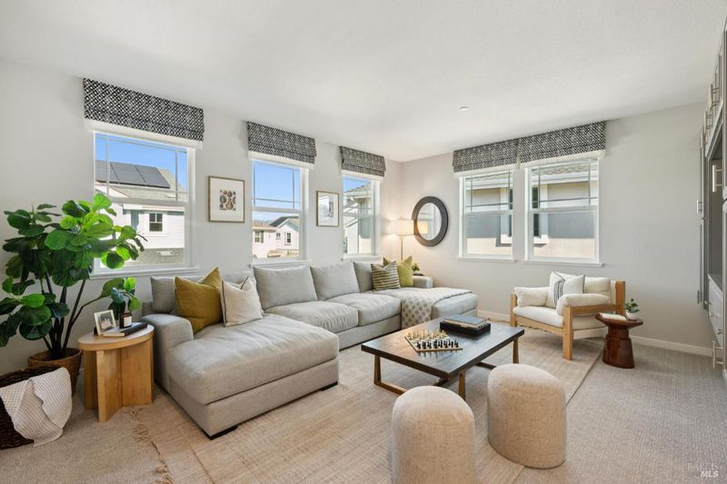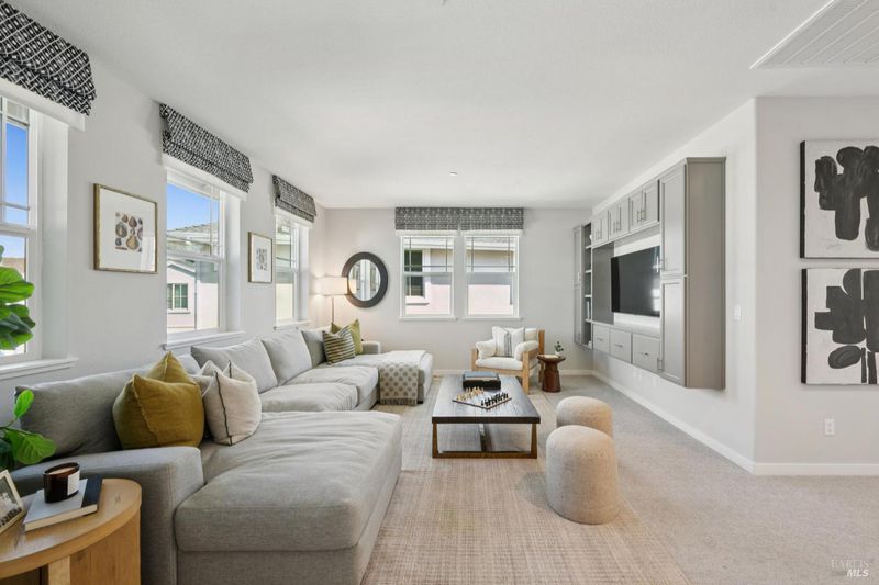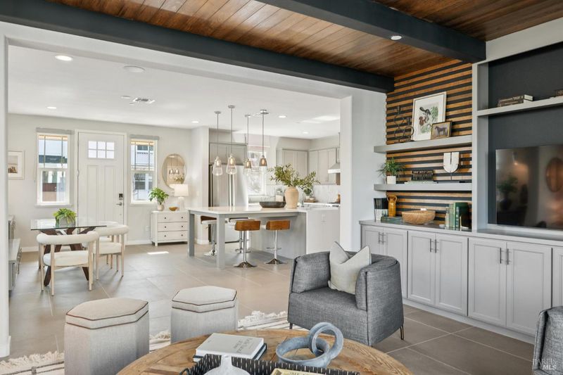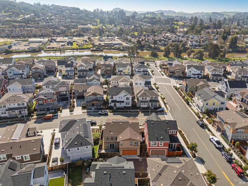 Outstanding opportunity to acquire a former model home in West Petaluma's sought-after Riverfront community, showcasing approximately $305,000 in builder upgrades. Completed in 2020, this like-new, thoughtfully designed 2,637 sq. ft. residence offers 4 bedrooms and 3 full bathrooms, including one bedroom and one full bathroom on the main level, ideal for guests or multi-generational living. Inviting curb appeal leads to a welcoming entry and expansive open-concept great room. The chef's kitchen features an enlarged quartz-draped island with eat-in dining, marble tile backsplash, upgraded cabinetry and a full suite of stainless Bosch appliances. The adjacent living area is enhanced by custom built-ins and open shelving, while the dining space offers built-in cabinetry with bench seating. Upstairs, a spacious and central family room with floating media cabinet provides a versatile second living area, connecting to three additional bedrooms and two bathrooms, including the luxurious primary suite with floating dual vanity, soaking tub, custom floor-to-ceiling tile and walk-in closet. The low-maintenance backyard features a patio ideal for outdoor dining and entertaining. Additional highlights include owned solar, dual-zone A/C, tankless water heater and epoxy garage floors. Riverfront offers a vibrant lifestyle with a neighborhood park, open space, scenic riverfront trails and easy freeway access, all just minutes to Historic Downtown Petaluma and within easy reach of the Sonoma Wine Country.