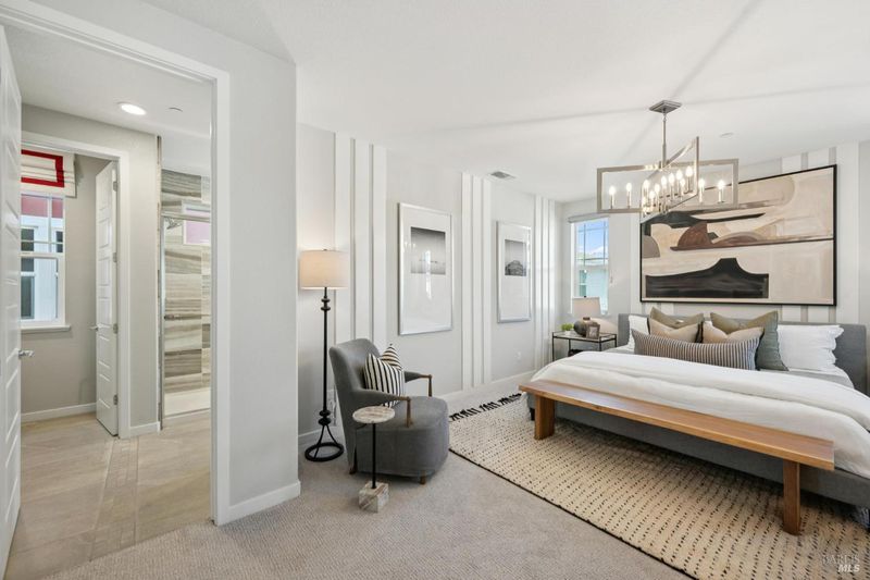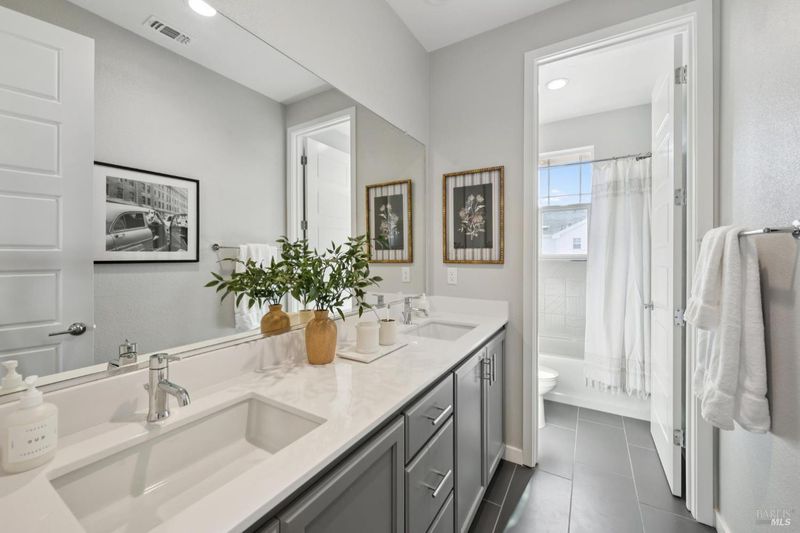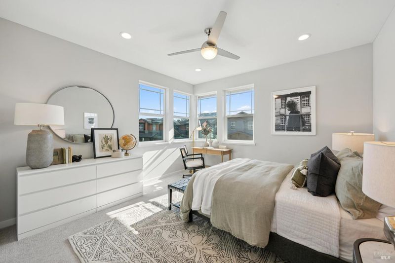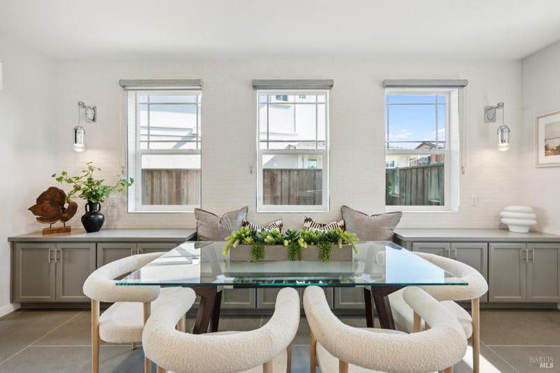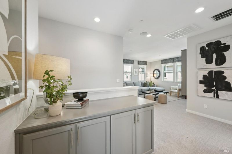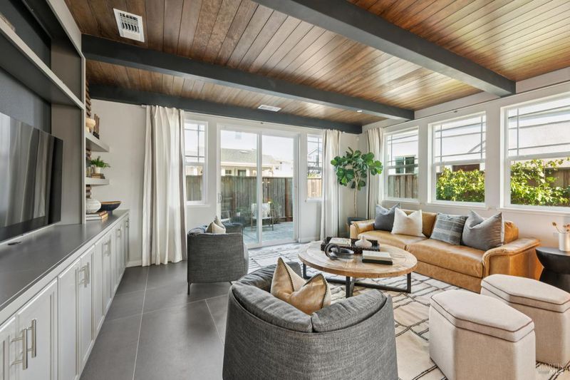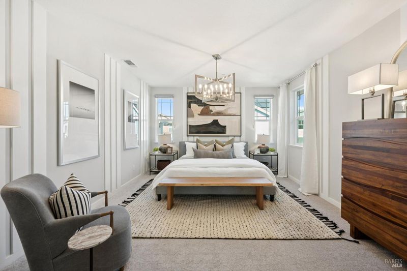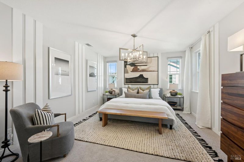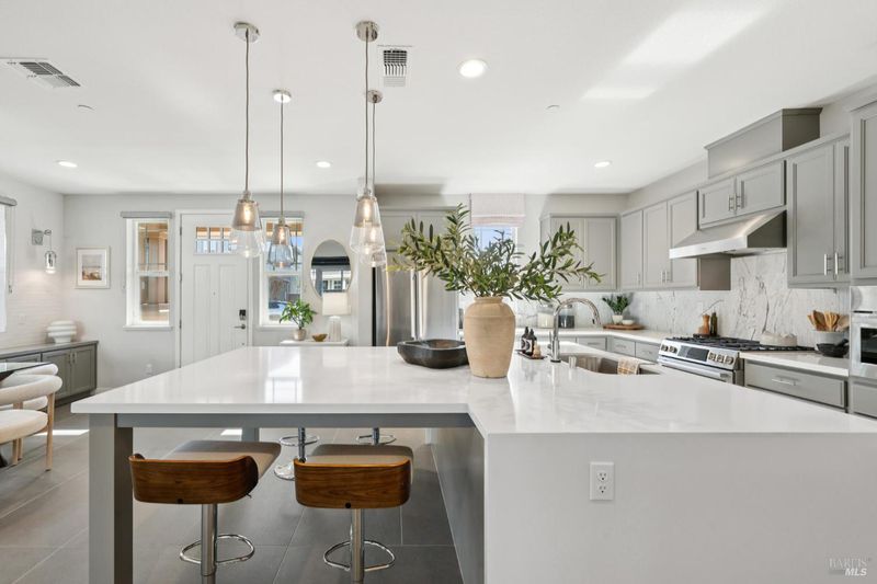 Outstanding opportunity to acquire a former model home in West Petaluma's sought-after Riverfront community, showcasing approximately $305,000 in builder upgrades. Completed in 2020, this like-new, thoughtfully designed 2,637 sq. ft. residence offers 4 bedrooms and 3 full bathrooms, including one bedroom and one full bathroom on the main level, ideal for guests or multi-generational living. Inviting curb appeal leads to a welcoming entry and expansive open-concept great room. The chef's kitchen features an enlarged quartz-draped island with eat-in dining, marble tile backsplash, upgraded cabinetry and a full suite of stainless Bosch appliances. The adjacent living area is enhanced by custom built-ins and open shelving, while the dining space offers built-in cabinetry with bench seating. Upstairs, a spacious and central family room with floating media cabinet provides a versatile second living area, connecting to three additional bedrooms and two bathrooms, including the luxurious primary suite with floating dual vanity, soaking tub, custom floor-to-ceiling tile and walk-in closet. The low-maintenance backyard features a patio ideal for outdoor dining and entertaining. Additional highlights include owned solar, dual-zone A/C, tankless water heater and epoxy garage floors. Riverfront offers a vibrant lifestyle with a neighborhood park, open space, scenic riverfront trails and easy freeway access, all just minutes to Historic Downtown Petaluma and within easy reach of the Sonoma Wine Country.