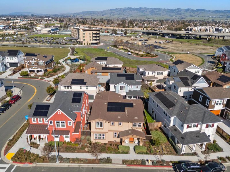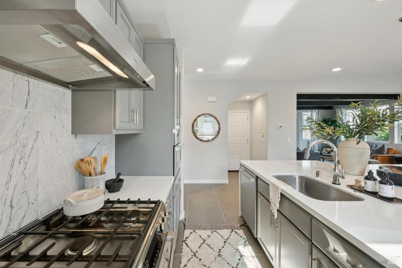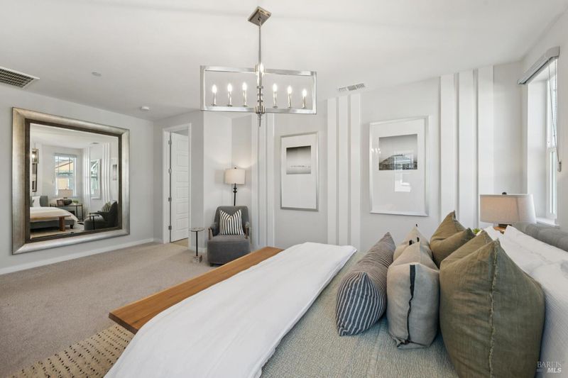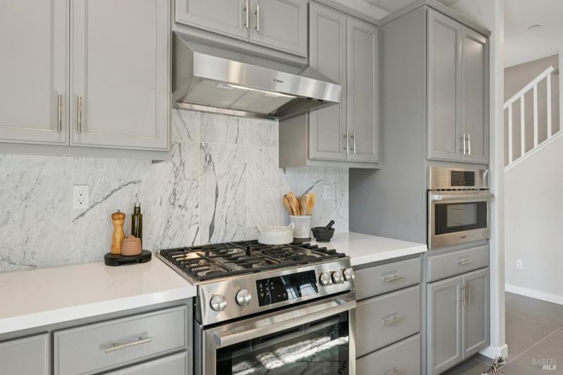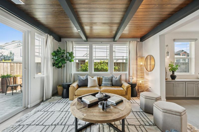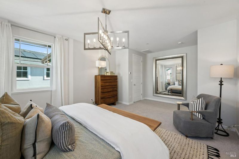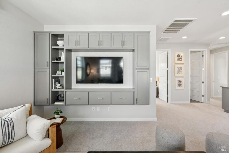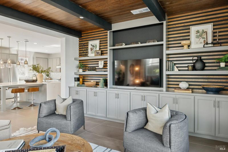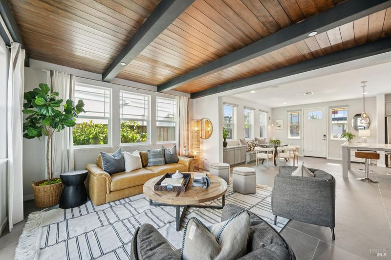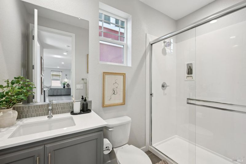 Outstanding opportunity to acquire a former model home in West Petaluma's sought-after Riverfront community, showcasing approximately $305,000 in builder upgrades. Completed in 2020, this like-new, thoughtfully designed 2,637 sq. ft. residence offers 4 bedrooms and 3 full bathrooms, including one bedroom and one full bathroom on the main level, ideal for guests or multi-generational living. Inviting curb appeal leads to a welcoming entry and expansive open-concept great room. The chef's kitchen features an enlarged quartz-draped island with eat-in dining, marble tile backsplash, upgraded cabinetry and a full suite of stainless Bosch appliances. The adjacent living area is enhanced by custom built-ins and open shelving, while the dining space offers built-in cabinetry with bench seating. Upstairs, a spacious and central family room with floating media cabinet provides a versatile second living area, connecting to three additional bedrooms and two bathrooms, including the luxurious primary suite with floating dual vanity, soaking tub, custom floor-to-ceiling tile and walk-in closet. The low-maintenance backyard features a patio ideal for outdoor dining and entertaining. Additional highlights include owned solar, dual-zone A/C, tankless water heater and epoxy garage floors. Riverfront offers a vibrant lifestyle with a neighborhood park, open space, scenic riverfront trails and easy freeway access, all just minutes to Historic Downtown Petaluma and within easy reach of the Sonoma Wine Country.