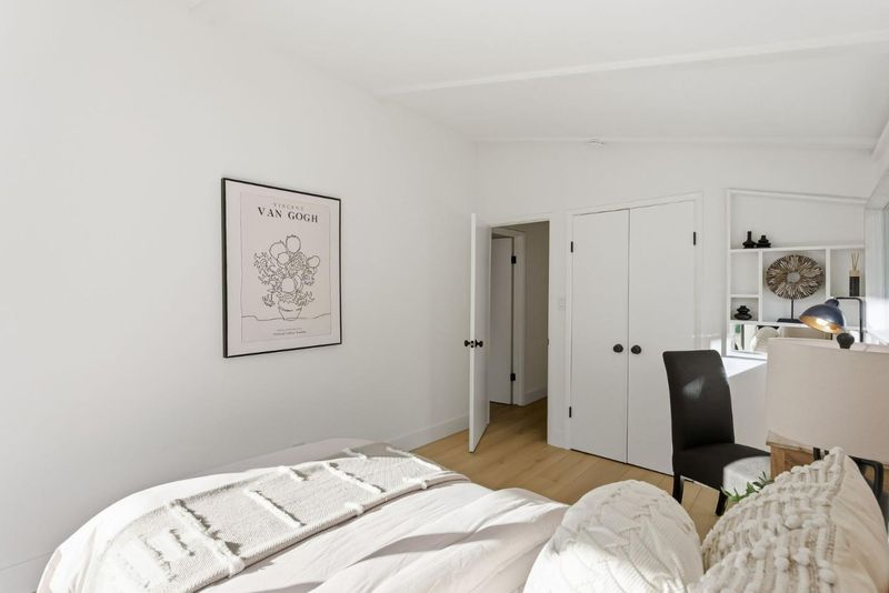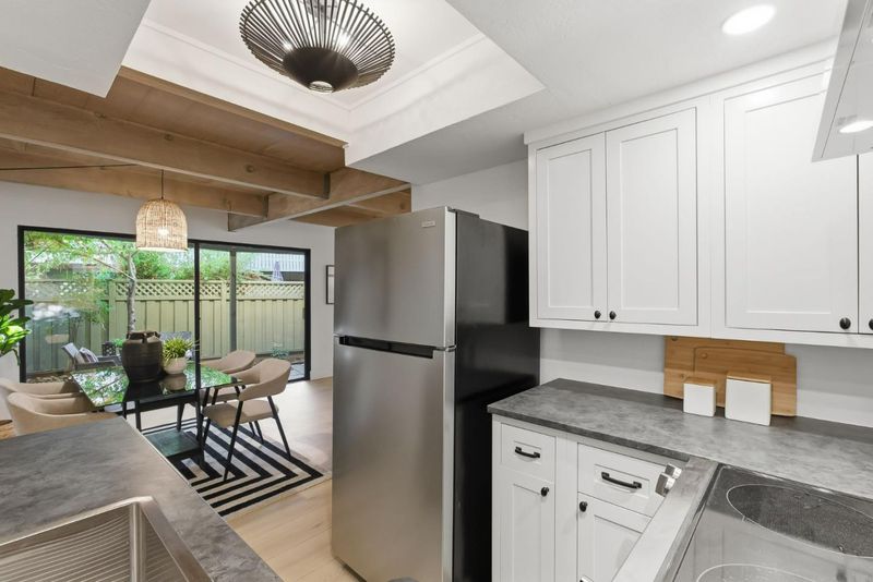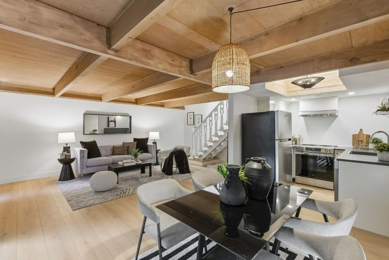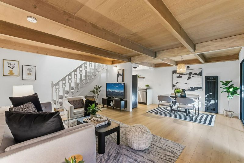 Beautifully remodeled townhome with 2 bedrooms, 1 bathroom, and access to outstanding Los Altos schools. This home features an open-concept design with natural wood beam ceilings and new wide-plank flooring throughout. The fully remodeled kitchen offers new cabinetry, stainless-steel appliances, and direct access to a private patio ideal for morning coffee or outdoor dining. Upstairs are two spacious bedrooms with vaulted ceilings and sliding glass doors opening to the balcony. The light-filled primary bedroom features two closets, including a walk-in. The remodeled bathroom enjoys a skylight, new flooring, a new bathtub, and a designer vanity. Community amenities include a pool, carport, and ample guest parking. Excellent, walkable location on the border of Palo Alto and Los Altos, with close proximity to shopping, dining, Caltrain, and major commute routes. Inside laundry may be added with HOA approval.