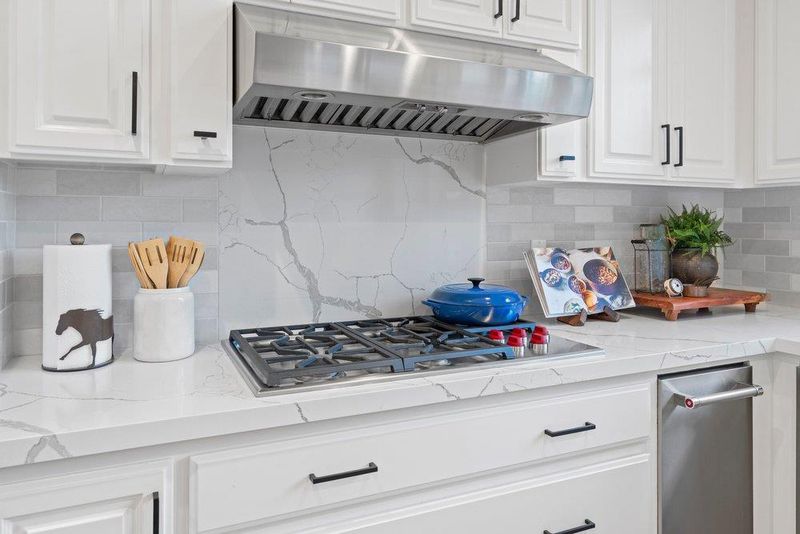 Dishwasher, Cooktop - Gas, Island, Microwave, Oven - Double, Countertop - Quartz, Pantry, Exhaust Fan, Refrigerator, Trash Compactor