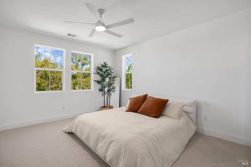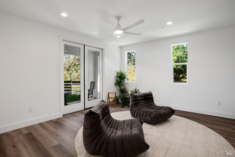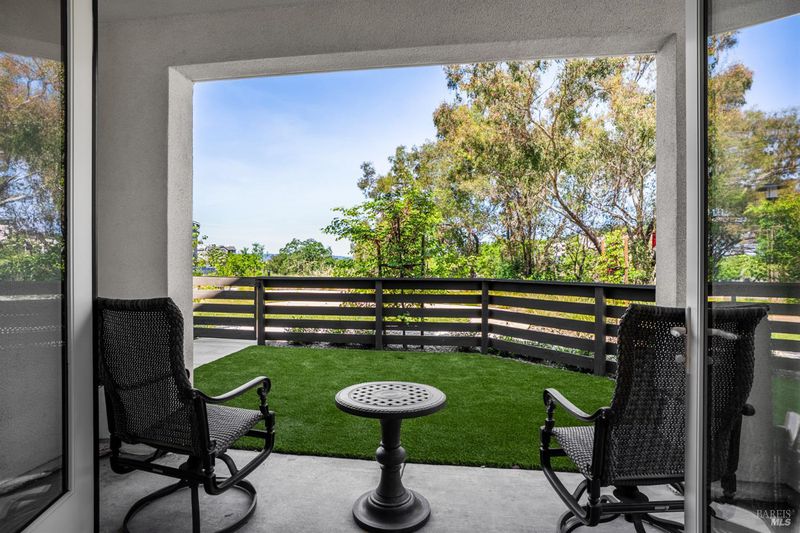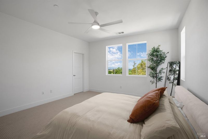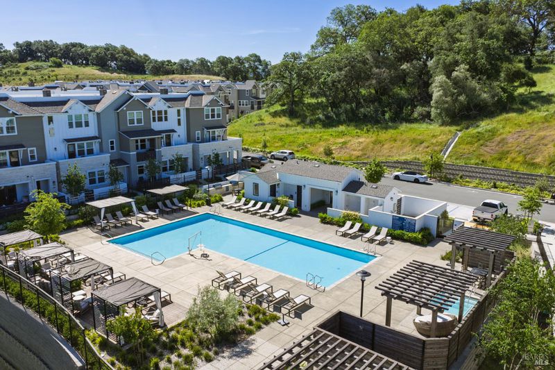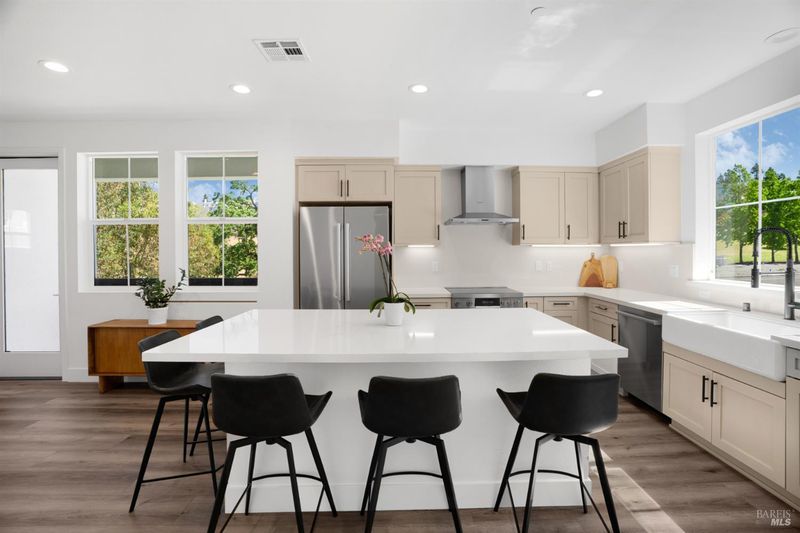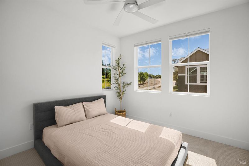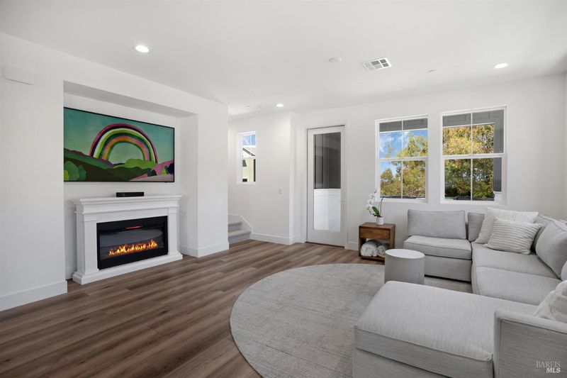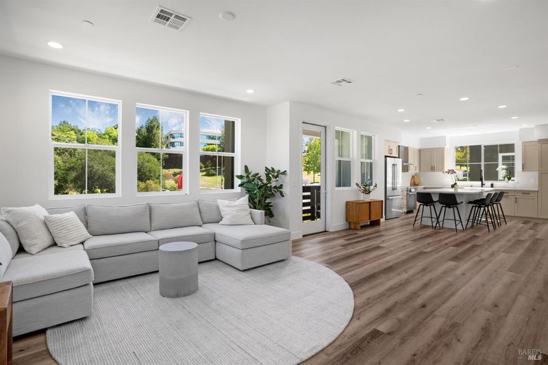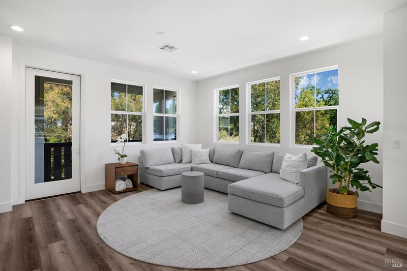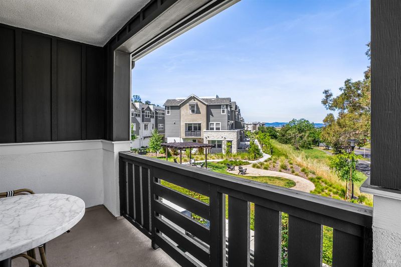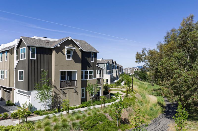 Welcome to this stunning end-unit townhome, where thoughtful upgrades, minimal maintenance, and resort-style living come together in Santa Rosa's desirable Fountaingrove neighborhood. Nestled just off a private pocket park, this 3-bedroom, 2.5-bath home offers 1,912 sq. ft. of well-appointed living space filled with natural light and is one of a handful of homes in the community where the main living area and primary bedroom look out onto mature trees, open space, and scenic views. The first-floor flex room sets the tone with upgraded built-in cabinetry featuring a quartz countertop and wine fridge, making it ideal as a home office, media room, casual entertainment space, or home gym. Open the French doors, and the front patio becomes a natural extension of the living area, creating an effortless indoor-outdoor flow. The open-concept second floor is the heart of the home, where a quartz island anchors a kitchen appointed with a farmhouse sink, soft-close cabinets, and premium Bosch appliances. Step out to relax on one of the two balconies, one which is perfectly positioned to soak in the breathtaking sunsets that outline the mountains in the distance. A conveniently located laundry room with upgraded built-in cabinetry and a half bath round out this thoughtfully designed level. The third floor features a generous primary suite with a walk-in closet, an en suite bath with separate vanities, and a walk-in shower. Tree views and open vistas frame the windows, creating a true private retreat. Two additional bedrooms and a full bathroom provide comfortable and flexible space for your needs. Step outside for a short walk to the community's resort-caliber pool and spa, multiple parks, and a community garden. Owned solar helps keep energy costs in check year-round. Ideally situated for everyday convenience, this home is minutes from Windsor, Healdsburg, and downtown Santa Rosa, with Kaiser Permanente within half a mile and Sutter Health under two miles away.