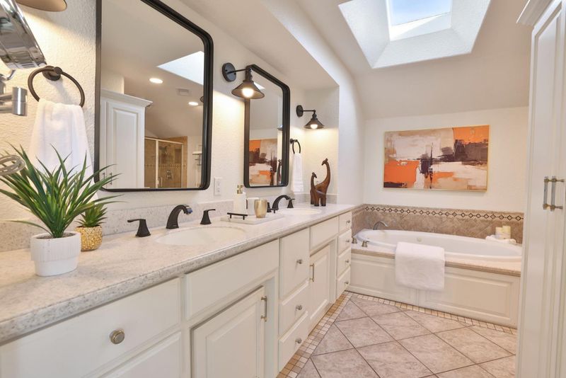 - Double Sinks, Primary - Oversized Tub, Primary - Stall Shower(s), Shower over Tub - 1, Skylight, Tile, Tub in Primary Bedroom