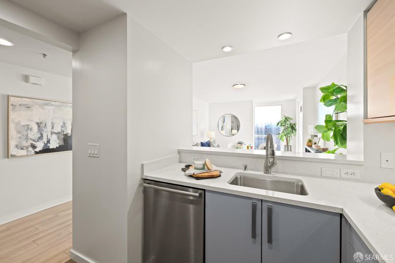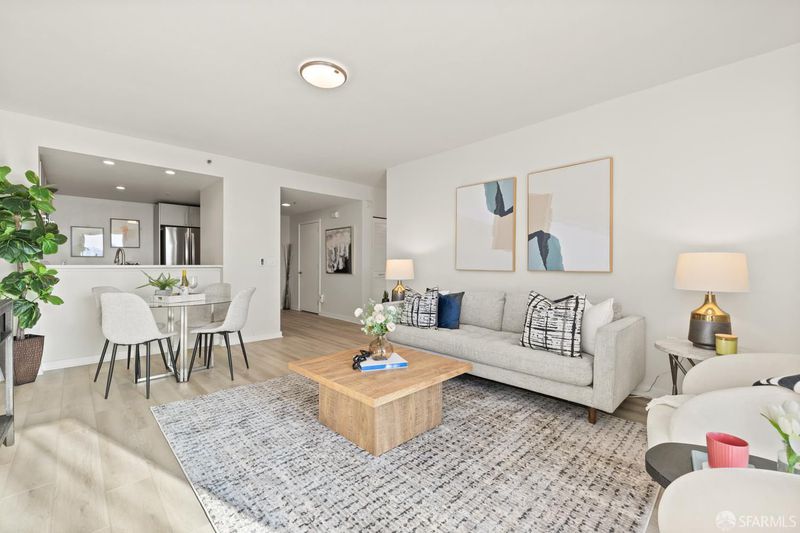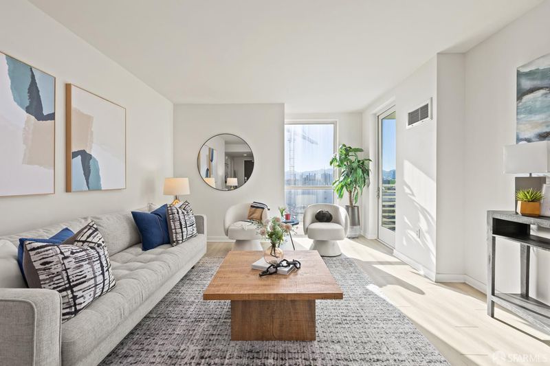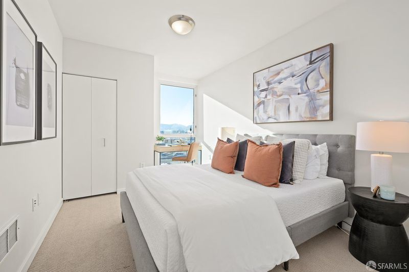 Discover urban luxury living at its finest in this sun-soaked, modern condo in the heart of South Beach/SOMA. Every corner of this meticulously designed residence exudes style and comfort. Oversized floor-to-ceiling windows flood the open living spaces with natural light, highlighting the impeccable finishes like Caesarstone countertops, European cabinetry, and BOSCH stainless steel appliances in the chef's kitchen. Step onto your private patio to savor views of the iconic San Francisco skyline from every room. With custom built-in closets, plush bedroom carpets, and stylish light wood-colored vinyl flooring, this home effortlessly combines practicality and elegance. The spa-like bathroom features a deep soaking tub and marble countertops, while an in-unit washer/dryer adds convenience. Embrace the luxury amenities of The Palms, keyless door entry, 24/7 lobby attendants, state-of-the-art gym, club lounge, movie theater, conference room, and a lush landscaped courtyard . Commuters will appreciate the proximity to Muni/CalTrain, Oracle Park, and major tech companies. Low monthly HOA dues and a deeded parking space make city living a breeze. Don't miss your chance to call this condo home and experience the ultimate in urban sophistication.